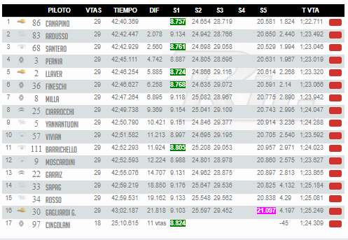 Con esta victoria, el piloto oriundo de Arrecifes quedó tercero en la tabla general con 31 puntos, detrás del puntero Leonel Pernía (39) y el mismo Santero (34). Por su parte, el platense Nicolás Moscardini se colocó en la posición 12, en una carrera en la que tuvo que reemplazar al campeón Matías Rossi.