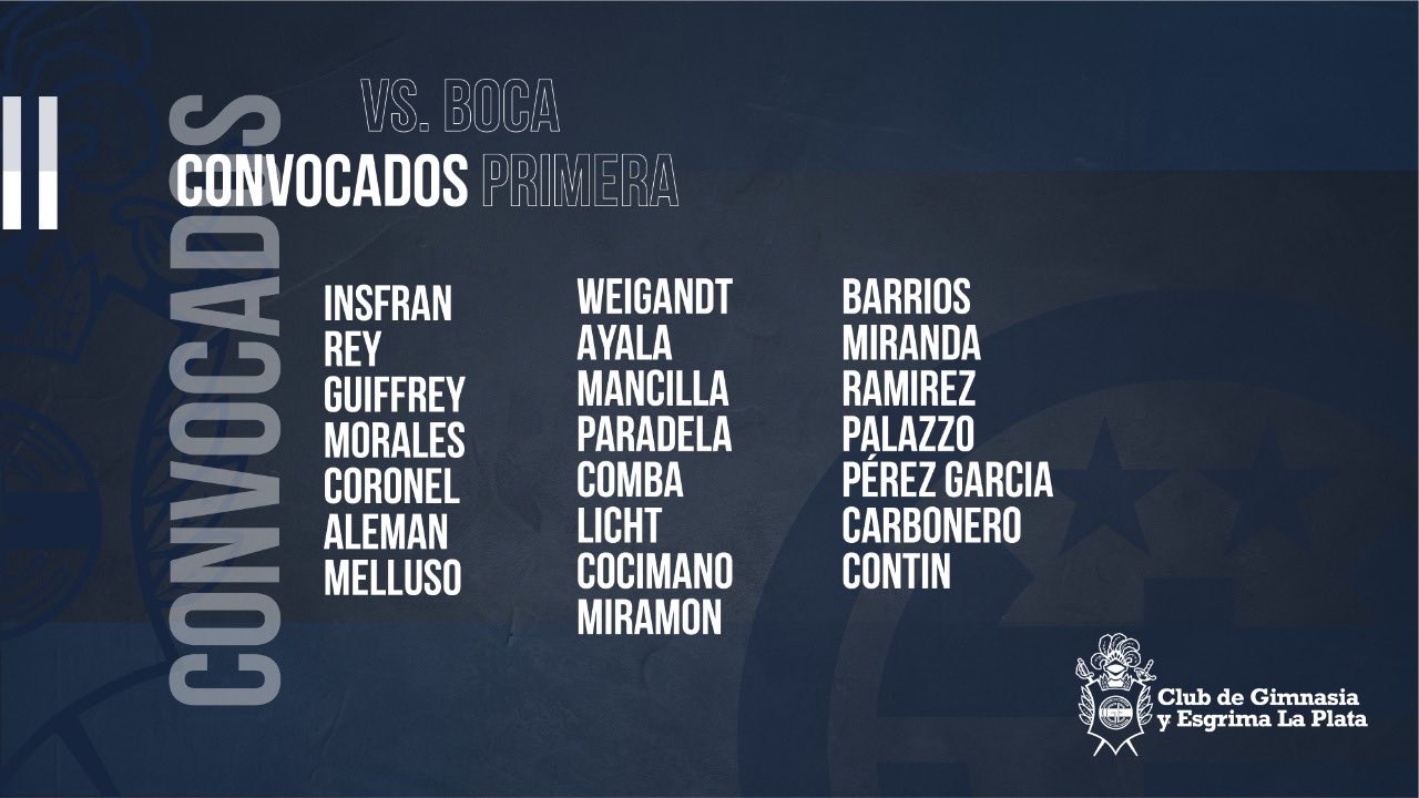 Gimnasia confirmó su lista de citados, con todo lo que tiene a disposición. Como Insfran en el arco y Alemán como eje de juego, el Lobo buscará dar el golpe en La Bombonera ante el Boca campeón. El probable equipo sería: Insfrán; Weigandt, Coronel, Guiffrey, Melluso; Ayala, Mancilla; Ramírez, Pérez García, Alemán; Contin.
