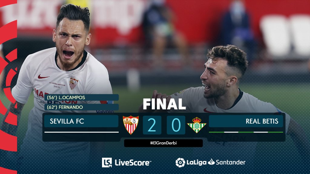 Luego de una primera etapa en la que el partido fue con más lucha que con buen juego, justamente Lucas Ocampos apareció para darle el primer tanto del cotejo al Sevilla. El argentino se hizo cargo de la ejecución de un penal a los 11 minutos del segundo tiempo y acomodó la pelota al palo contrario del arquero para adelantar a su equipo en el marcador. Luego, el brasileño Fernando ganó en el aire y cabeceó para poner el 2 a 0 definitivo para el conjunto local, que con este triunfo se posiciona en la tercera ubicación del certamen con 47 unidades.