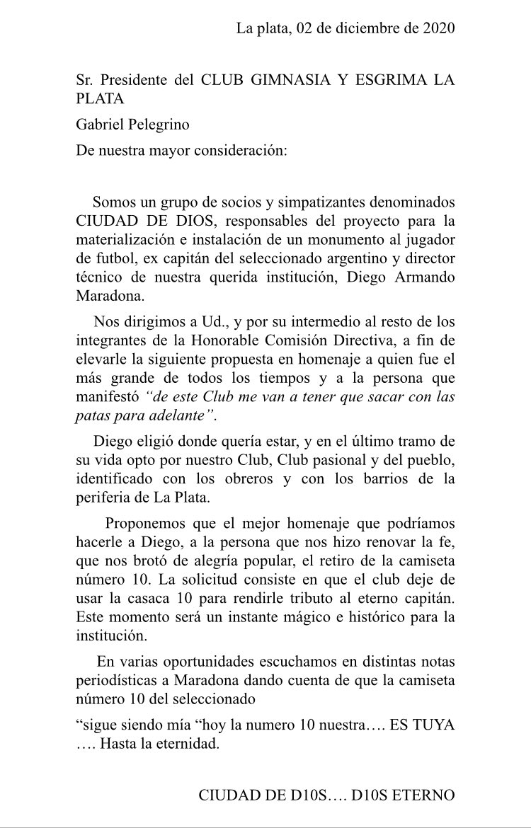 "El mejor homenaje que podríamos hacerle a Diego, a la persona que nos hizo renovar la fe, que nos brotó de alegría popular, es el retiro de la camiseta número 10. Este momento será un instante mágico e histórico para la institución”, aseguró en la carta el grupo denominado “Ciudad de Dios”, liderado por Horacio Galeano, socio que firma la carta.