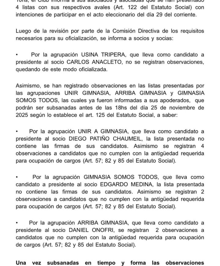 Las otras tres listas —Unir a Gimnasia, Gimnasia Somos Todos y Arriba Gimnasia— fueron observadas por distintos incumplimientos, principalmente por la falta de firmas obligatorias y por la inclusión de candidatos que no reúnen la antigüedad mínima requerida para ocupar cargos, según los artículos 57, 82 y 85 del Estatuto Social.