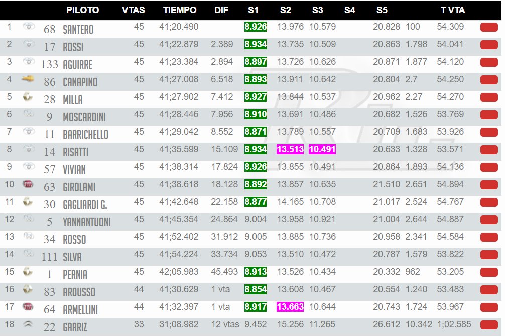 Además del piloto de Toyota Gazoo Racing, el podio lo completaron su compañero y líder del campeonato, Matías Rossi y Valentin Aguirre (Midas Carrera Team). Tras la victoria, Santero destacó su alegría por su primera victoria: "Se demoró en llegar, pero se logró. La más difícil siempre es la primera y espero que ahora lleguen muchas más".