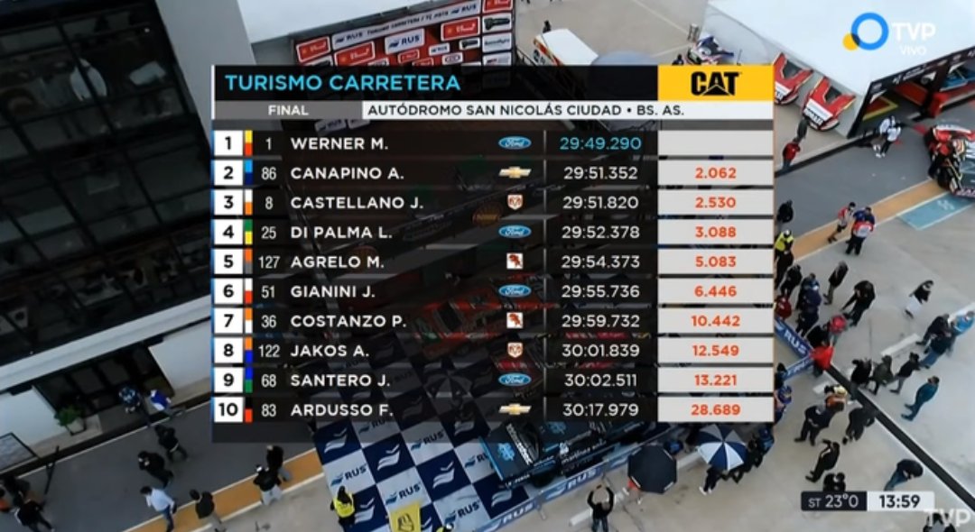 De esta manera, Mariano Werner marcó la serie más rápida con 5:50.560, mientras que Juan Martín Trucco hizo 5:54.115. Canapino fue el protagonista de la más lenta marcando 8:00.514.