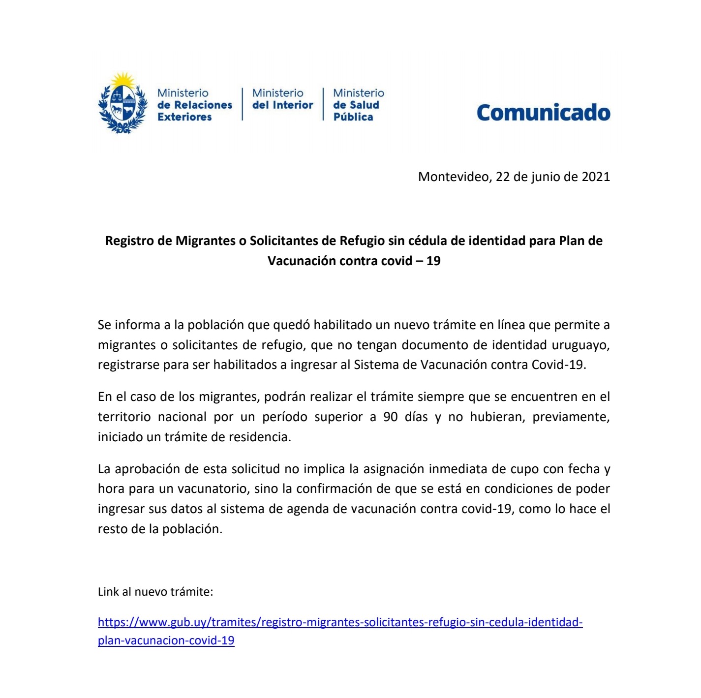 Los interesados podrán realizar el trámite entrando en la página https://www.gub.uy/tramites/registro-migrantes-solicitantes-refugio-sin-cedula-identidad-plan-vacunacion-covid-19 y siguiendo las instrucciones.