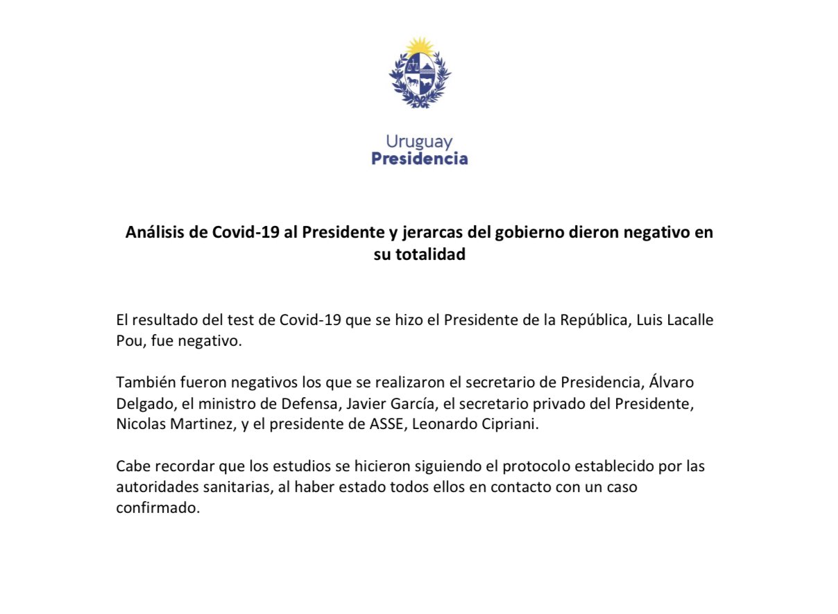 Luego de haber sido aislado por precaución, el presidente de Uruguay, Luis Lacalle Pou, dio negativo de coronavirus tras el test realizado. Además dieron negativos de Covid-19, el secretario de la presidencia, Álvaro Delgado; el ministro de defensa, Javier García; el secretario privado del Presidente, Nicolás Martínez; y el presidente de ASSE, Leonardo Cipriani.