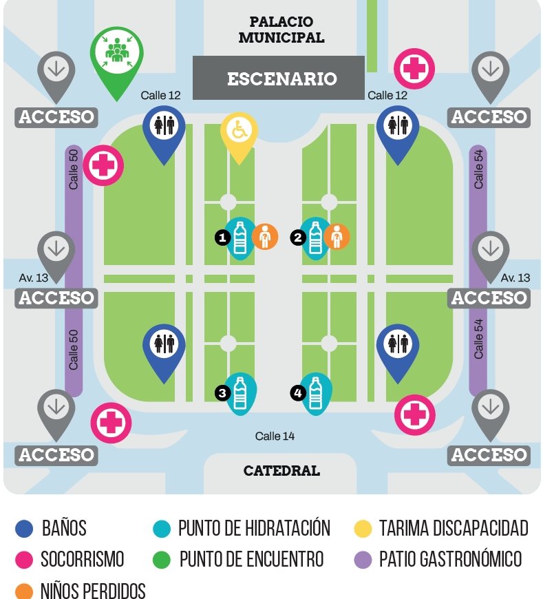 El escenario principal de la celebración central estará ubicado sobre calle 12 entre 51 y 53. Para agilizar la circulación, se definieron seis accesos distribuidos en diagonales y laterales: diagonal 73 y 54, 13 y 54, diagonal 74 y 14, diagonal 74 y 50, 13 y 50, y diagonal 73 y 14.