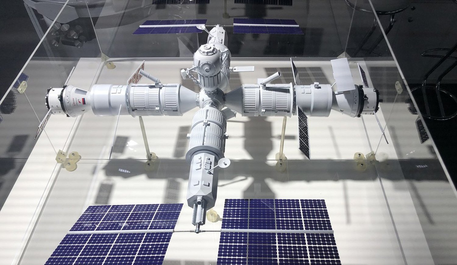 El modelo revela que no solo se pondrá en órbita los módulos de base, ciencia y energía, de nodo y de esclusa, sino también un módulo de destino, un módulo de producción y una plataforma de mantenimiento.