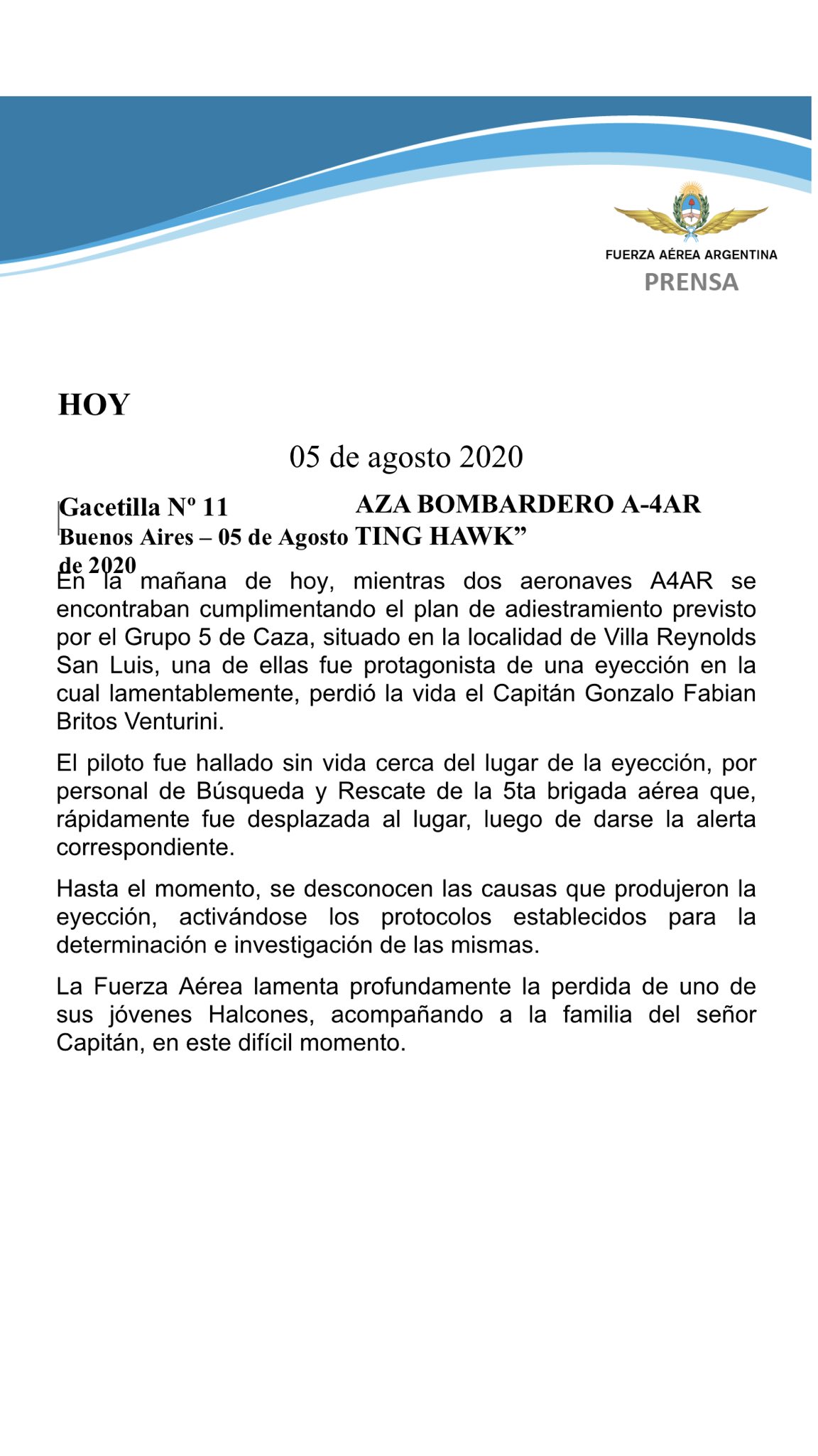 La jornada de este miércoles se puso oscura desde el mediodía, cuando un accidente aéreo tiñó el aire de luto. El capitán Gonzalo Fabián Britos Venturini realizaba ejercicios militares de rutina en el sur de la provincia de Córdoba cuando decidió eyectarse de su aeronave. El impacto con tierra firme le provocó la muerte.