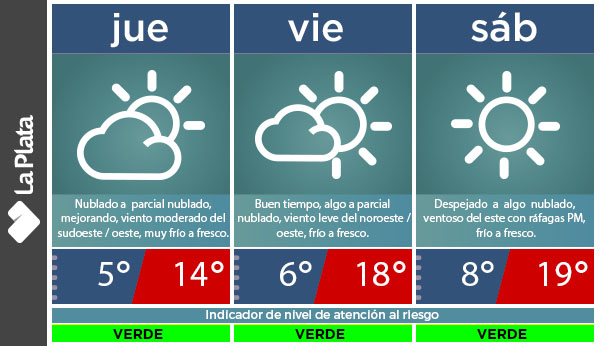 La Direccion de Hidrometeorología de la Municipalidad de La Plata confirmó que será una jornada parcialmente nublada tras el miércoles lluvioso y la tormenta en la Ciudad. Además se señaló que seguirá la baja temperatura, ya que producirá una mínima de 5 grados y máxima de 14.