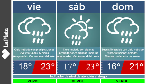 La semana terminará cargada de lluvia. En lo que respecta a este viernes, las malas condiciones continuarán en la ciudad de La Plata pero se esperan mejoras temporarias. El cielo permanecerá nublado con precipitaciones leves y aisladas. Según informó la Dirección de Hidrometeorología de la Municipalidad, la temperatura mínima será de 18 grados y la máxima de 23 grados.