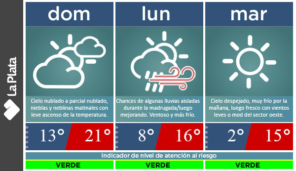 La Direccion de Hidrometeorología de la Municipalidad de La Plata confirmó que habrá una jornada nublada en la Ciudad y con momentos de neblina. A su vez, la temperatura aumentará con respecto a los últimos días, ya que habrá una mínima de 13 grados y una máxima de 21.