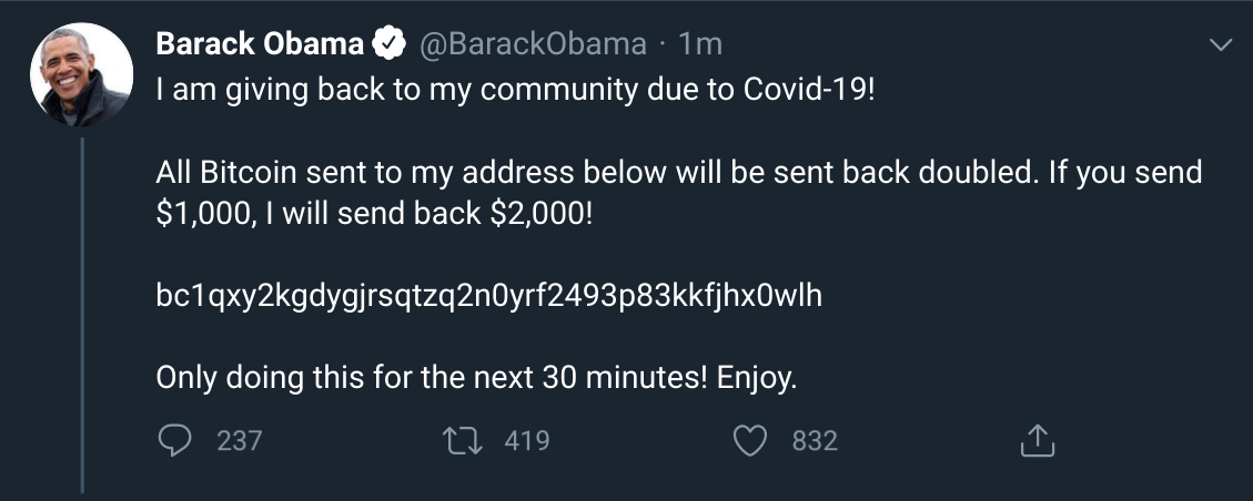 Maquillado tras un acto solidario para combatir la pandemia imperante, el plan consistió en simular que los afectados doblarían el dinero que cualquier usuario de la red social del pajarito transfiriera a una cuenta de bitcoins.