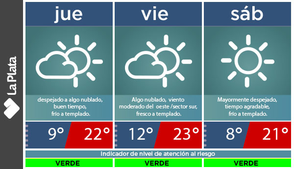 La Direccion de Hidrometeorología de la Municipalidad de La Plata confirmó que que será una jornada estable en la Ciudad, con buena temperatura y un cielo mayormente despejado, pero con algunos momentos de nubes. La mínima alcanzará los 9 grados, mientras que la máxima llegará a los 22.