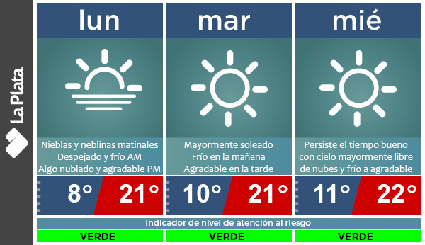 La semana en la ciudad de La Plata comenzará con nuenas condiciones de tiempo. El cielo estará despejado y habrá neblinas matinales. El día estará fresco por la mañana y agradable por la tarde, siendo la temperatura mínima de 8 grados y la máxima de 21, según anunció la Dirección de Hidrometeorología del municipio.