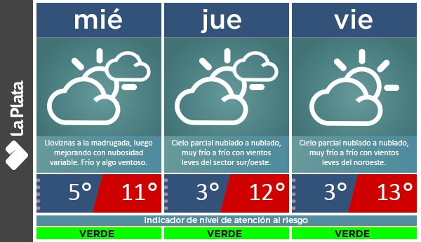 Luego de las lluvias y las fuertes tormentas, el miércoles en la ciudad de La Plata tendrá una jornada nublada y ventosa, con ráfagas de hasta 49 km/h. Por su parte, la temperatura tendrá una mínima de 5 grados y una máxima de 11.
