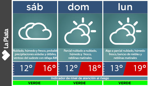 El Servicio Meteorológico anunció que habrá un sábado nublado en la ciudad de La Plata, con una mínima de 12 grados y una máxima de 16. Además se podrán producir algunas precipitaciones aisladas y débiles.