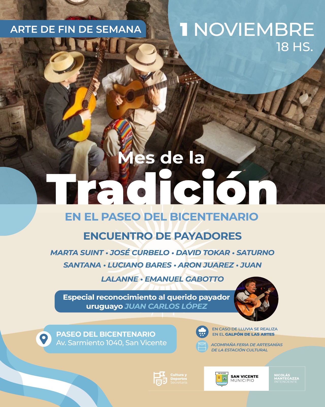 El próximo sábado 1 de noviembre desde las 17:30 horas en el Paseo del Bicentenario, ubicado en Avenida Sarmiento 1040 de San Vicente, el Municipio celebrará el Mes de la Tradición con una jornada especial que incluirá un homenaje al recordado Pancho Gandola y un encuentro de payadores con destacados artistas locales y regionales.