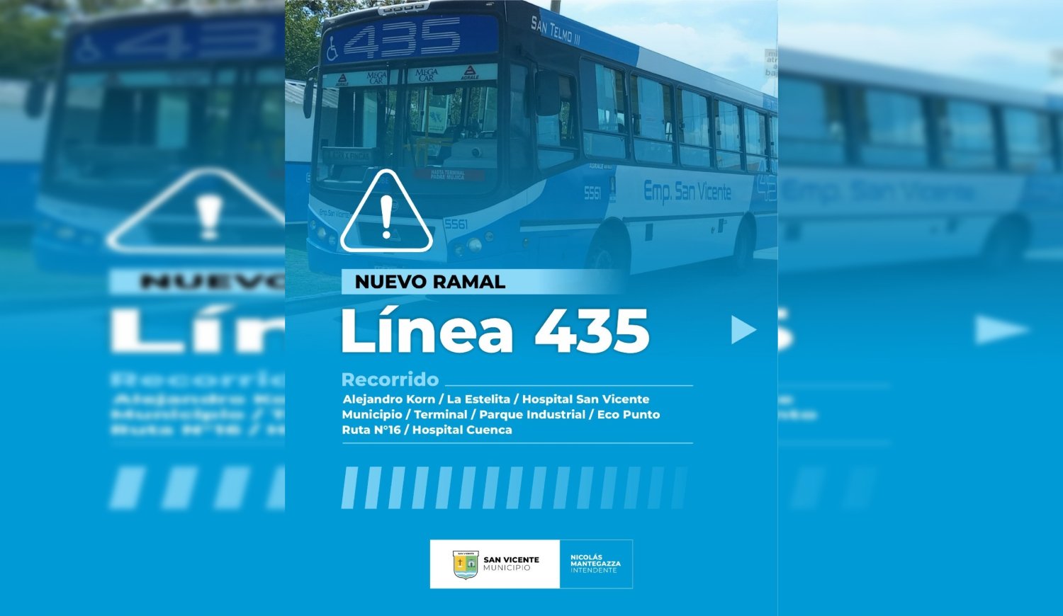 Mediante las gestiones realizadas por el intendente Nicolás Mantegazza ante la empresa San Vicente SAT y autoridades de la Secretaría de Transporte, ya está en funcionamiento el nuevo trayecto de la línea 435, que une la estación de Alejandro Korn con el Hospital Cuenca Alta Néstor Kirchner de Cañuelas.