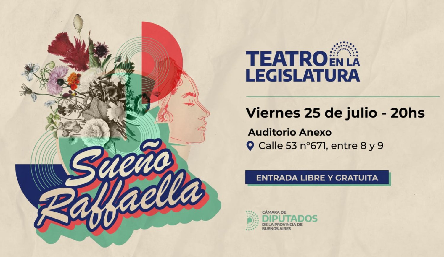 La Cámara de Diputados de la provincia de Buenos Aires continúa impulsando propuestas culturales abiertas a la comunidad. En esta oportunidad, el ciclo Teatro en la Legislatura presenta la obra “Sueño Raffaella”, una comedia dramática escrita por Guillermo Farisco, dirigida por Silvia Silva y protagonizada por María Fernanda Francucci, Silvia Bek y Gaby Barrios.