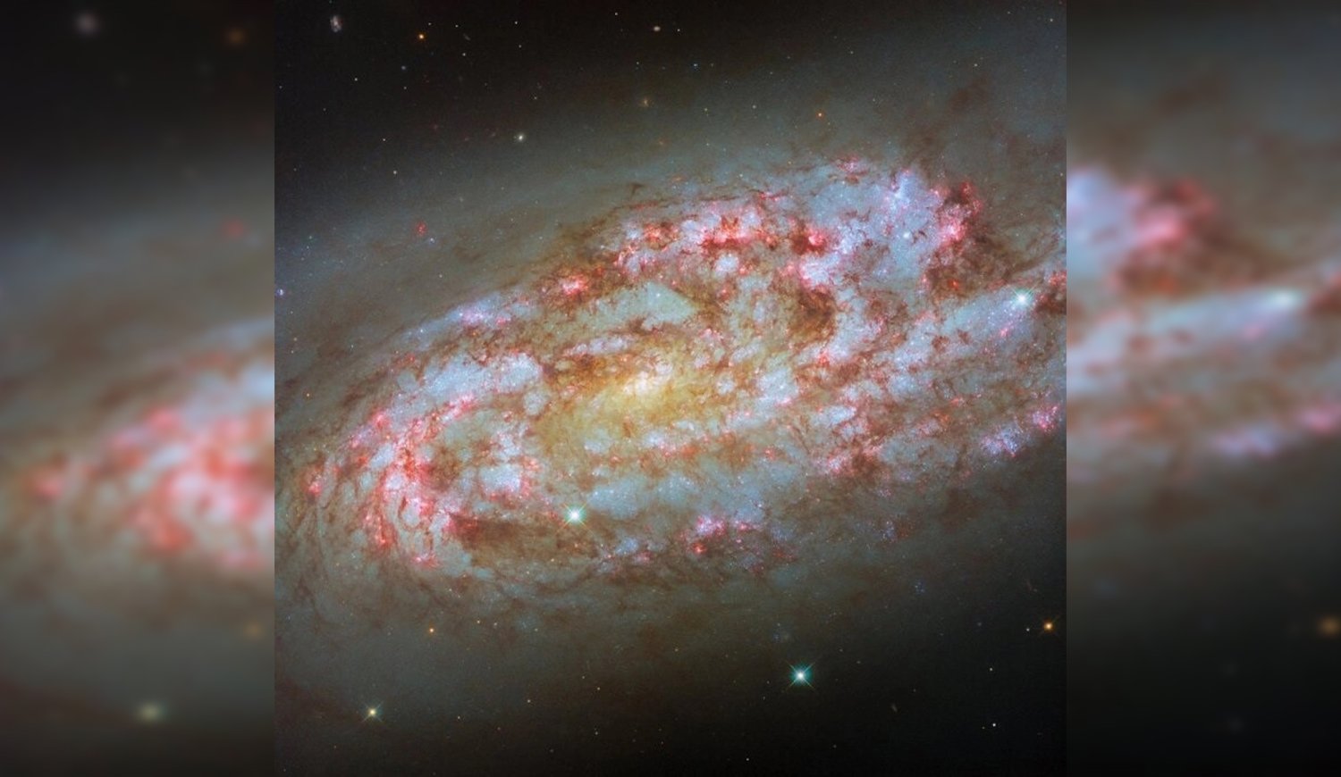 El Hubble ya mostró esta galaxia en 2020. La nueva imagen de esta semana incluye datos adicionales recopilados a lo largo de 2025, lo que proporciona una visión más profunda de la turbulenta actividad astrofísica que se desarrolla en la galaxia. Las luces rojas que se abren en los brazos señalan la llamada emisión H-alfa de densas nubes de moléculas de hidrógeno.