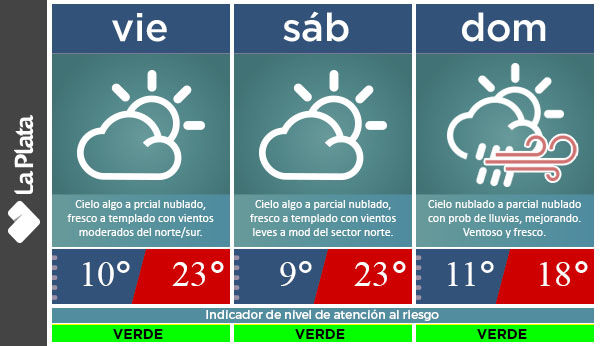 Según anunció la Direccion de Hidrometeorología de la Municipalidad de La Plata, será un viernes de temperatura estable y un cielo parcialmente nublado en la Ciudad, manteniendo un clima bien primaveral como se vivió durante la semana. Se detalló que la temperatura mínima alcanzará los 9 grados y la máxima los 23.