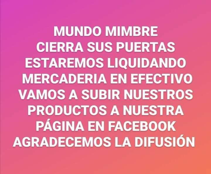 Así lo anunció en su cuenta de Facebook: "Mundo Mimbre cierra sus puertas. Estaremos liquidando mercaderá en efectivo. Vamos a subir nuestros productos a nuestra página de Facebook y agradecemos su difusión".