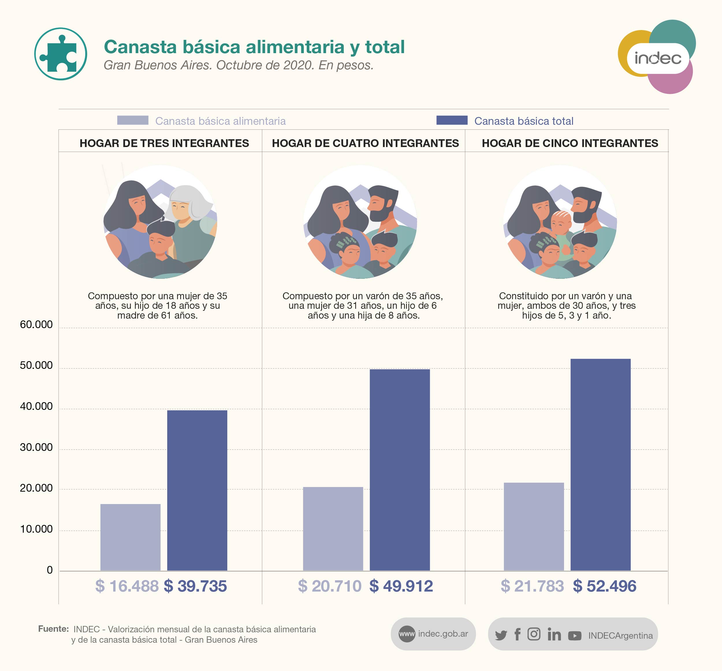 Según publicó el Instituto Nacional de Estadísticas y Censos (Indec), una familia de cuatro necesitó en el mes de octubre $49.911,60 para no ser pobre.