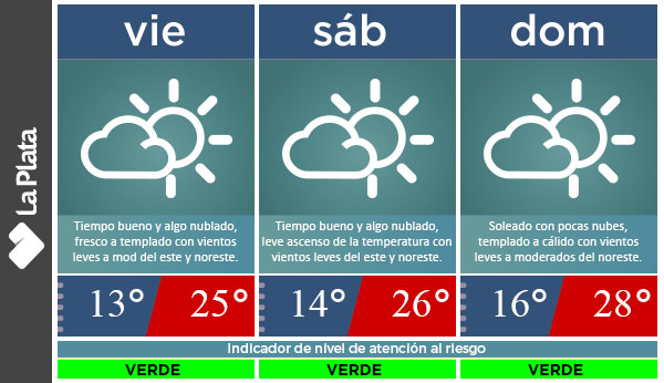 Será una buena jornada en la Ciudad, ya que continúa la temperatura estable y el tiempo bueno. Según anunció la Direccion de Hidrometeorología de la Municipalidad de La Plata, tendremos un cielo parcialmente nublado, que estará acompañado por una mínima de 13 grados y una máxima de 25.