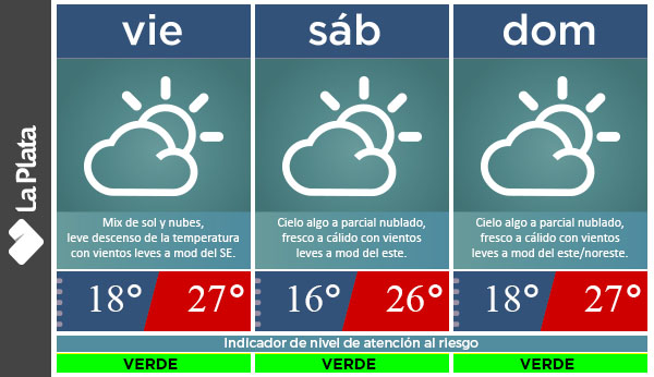 Será una jornada parcialmente nublada en La Plata, con una temperatura mínima de 18° y una máxima de 27°.
