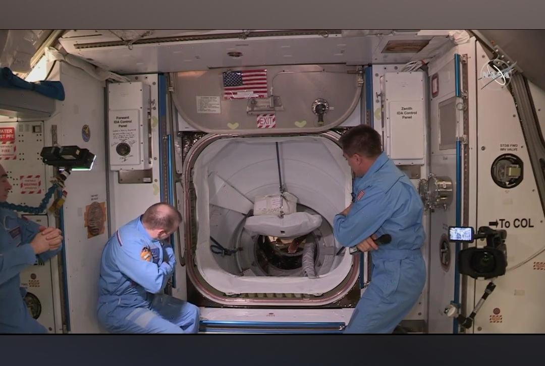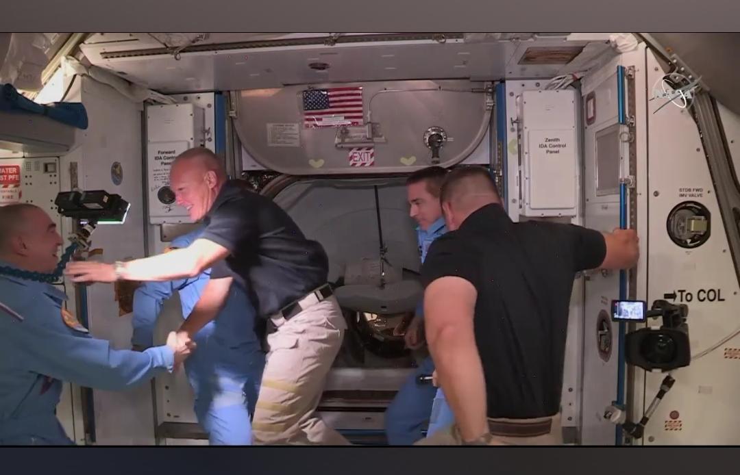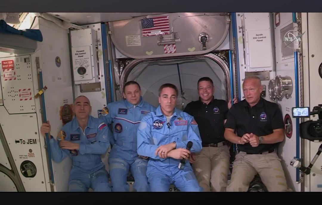 Tras casi tres horas de operaciones de control, conexión y compensación de presión y temperatura entre nave y estación, Behnken y Hurley abrieron la escotilla a las 17.02, hora GMT, y fueron recibidos a bordo de la Estación por su comandante, el astronauta Chris Cassidy, y los cosmonautas rusos Anatoli Ivanishin e Ivan Vagner para convertirse en miembros de la tripulación de la Expedición 63.
