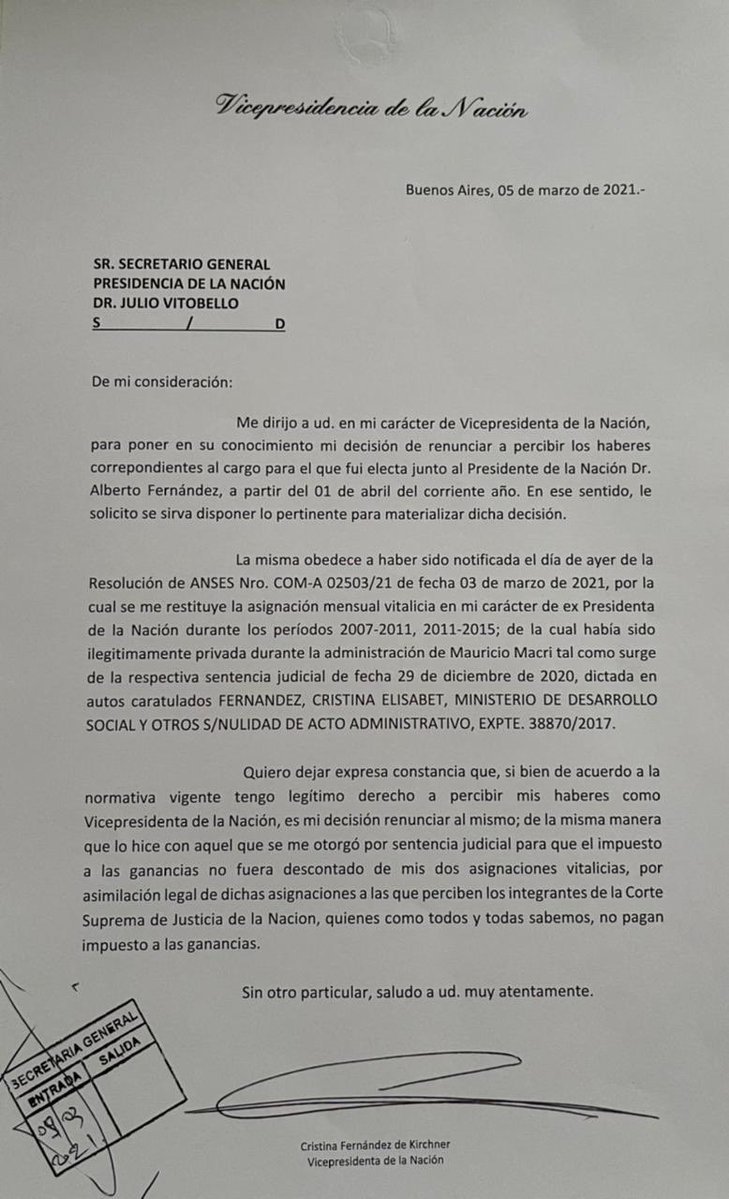 "Me dirijo a usted en mi carácter de Vicepresidenta de la Nación, para poner en su conocimiento mi decisión de renunciar a percibir los haberes correspondientes al cargo para el que fui electa junto al Presidente de la Nación Dr. Alberto Fernández, a partir del 01 de abril del corriente año. En ese sentido, le solicito se sirva disponer lo pertinente para materializar dicha decisión ” dice la ex mandataria en la misiva.