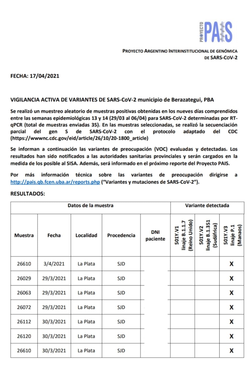 Es decir, el estudio del Consorcio interinstitucional para la Secuenciación del genoma y estudios genómicos de SARS-COV-2 (Proyecto PAÍS), citado por el titular de la cartera sanitaria, indica que 26 de 35 muestras secuenciadas evidencian la variante 501Y.V3 (Manaos).