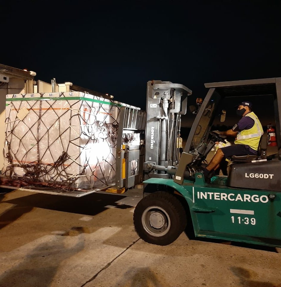 Una partida de 580 mil vacunas contra el coronavirus producidas en India arribó al país esta madrugada en un vuelo de la compañía Qatar y fueron descargadas en la Terminal de Cargas del aeropuerto Internacional de Ezeiza para su posterior distribución.