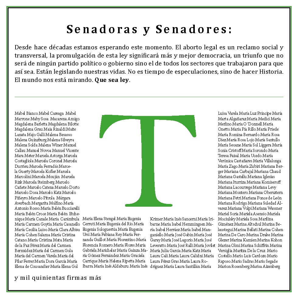 “No es tiempo de especulaciones, sino de hacer Historia. El mundo nos está mirando. Que sea ley”, concluye el texto.