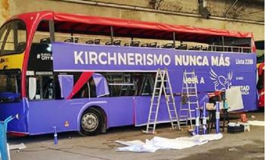 El vehículo desarrolla el servicio de recorridas a través de la firma internacional Gray Line y pertenece a la compañía de micros Andesmar, según reveló el portal El Destape. De acuerdo a la foto que se difundió, estará ploteado con el característico color violeta libertario, el logotipo de un ave en vuelo y una inscripción todo a lo largo que reza “kirchnerismo, nunca más”.