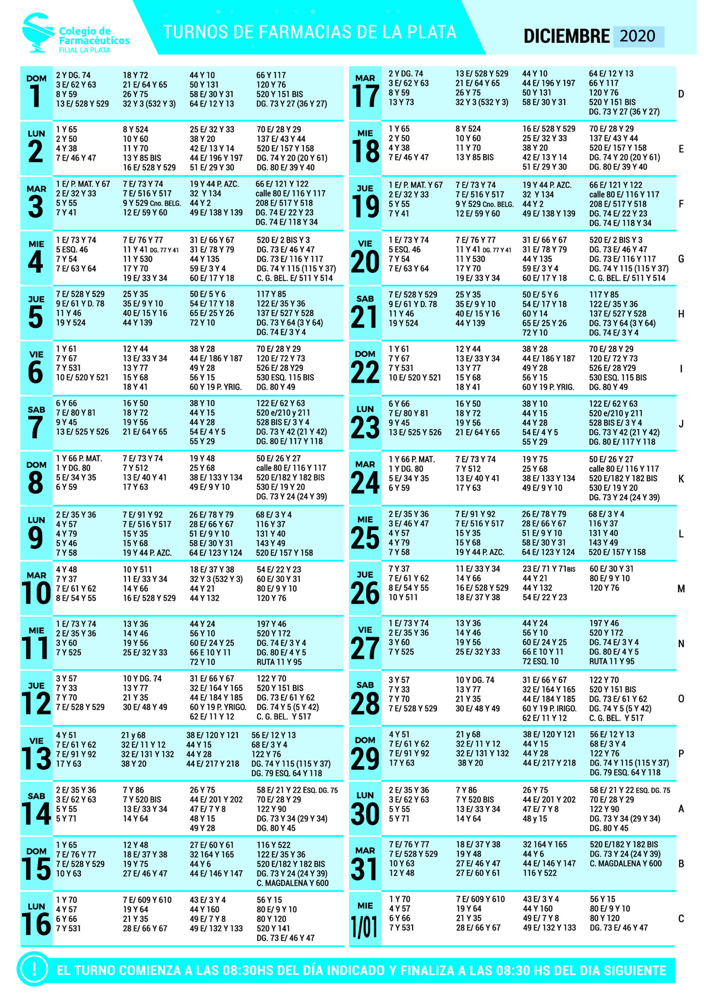 Estas son las farmacias de turno en el mes de diciembre del 2020. Recuerde que los turnos comienzan a las 8:30hs del día indicado y finalizan a la misma hora del día siguiente: