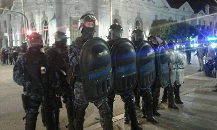 Según allegados, unas 50 participantes de la marcha comenzaron a arrojar piedras y bombas molotov contra edificios y uniformados de la fuerza de seguridad provincial. Ante esos hechos, la Guardia de Infantería de la Policía de Chubut decidió avanzar para repeler los ataques.